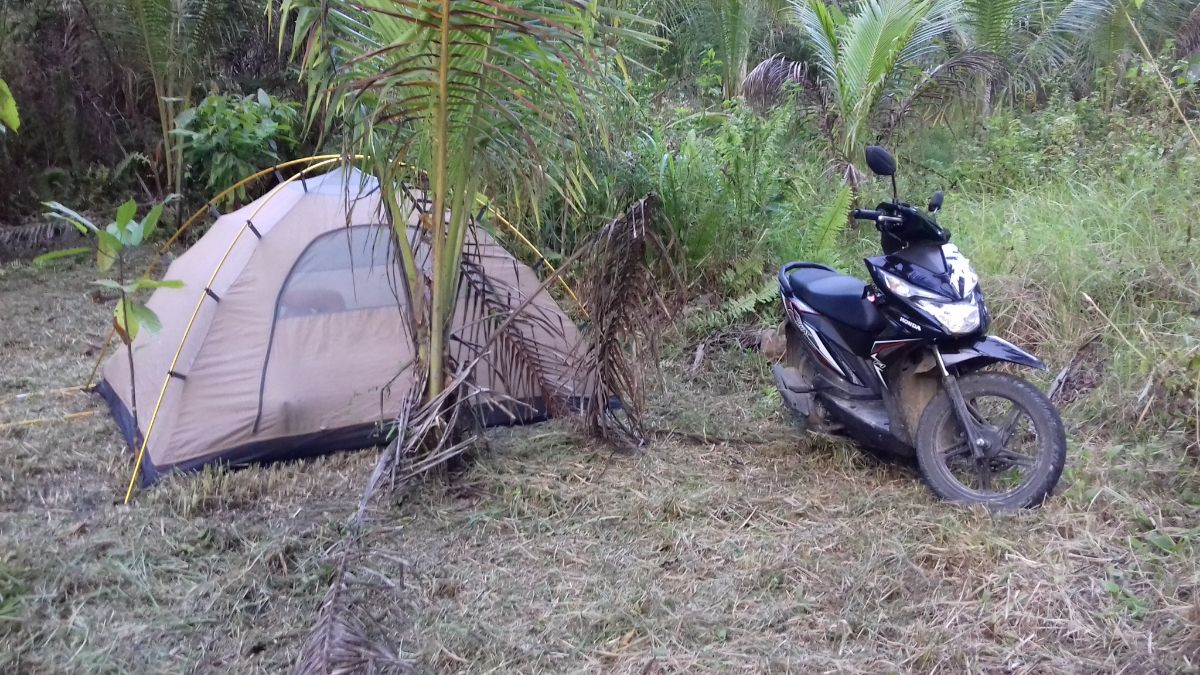 Для ночевки нашли великолепное место под пальмами. Это был съезд с основной дороги на чью-то плантацию кокосовых пальм. А самое большое достоинство этого места было в том, что под пальмами была газонокосилкой подстрижена трава, т.е. спать на свежескошенном сене было очень мягко и уютно.