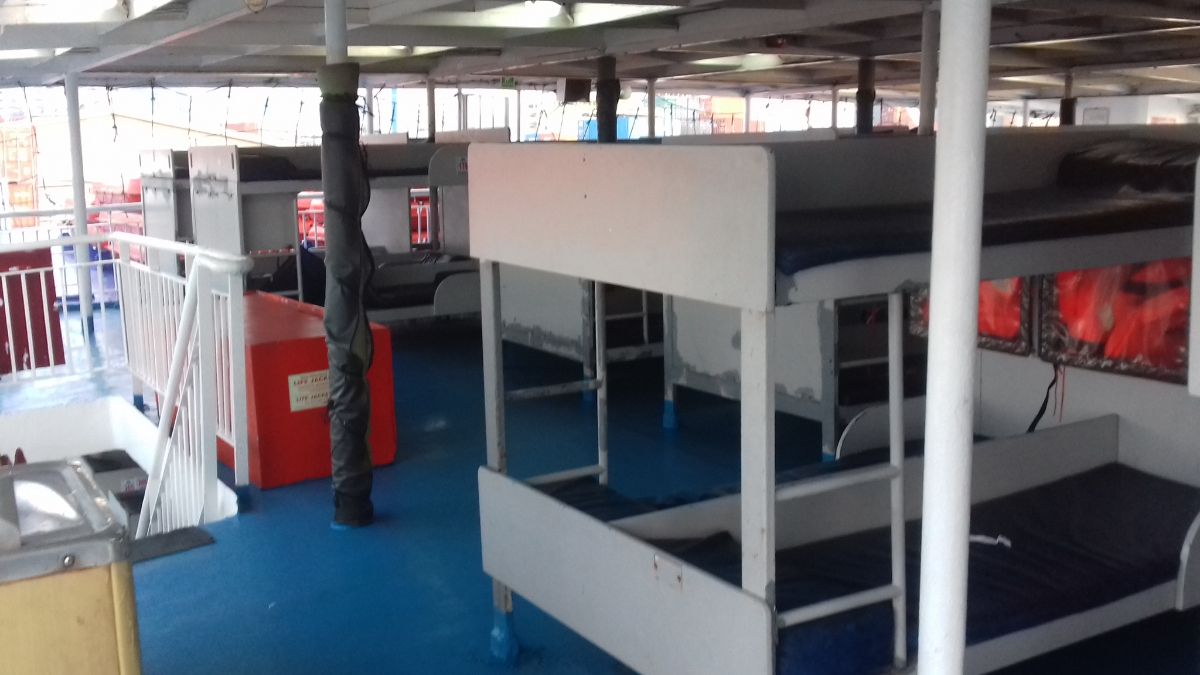 Ровно в 20.00 началась посадка на паром. У нас были места на третьей палубе. Спальные места были представлены в виде двухярусных железных кроватей с кожанными матрасами. У нас было верхнее и нижнее место, соответственно.