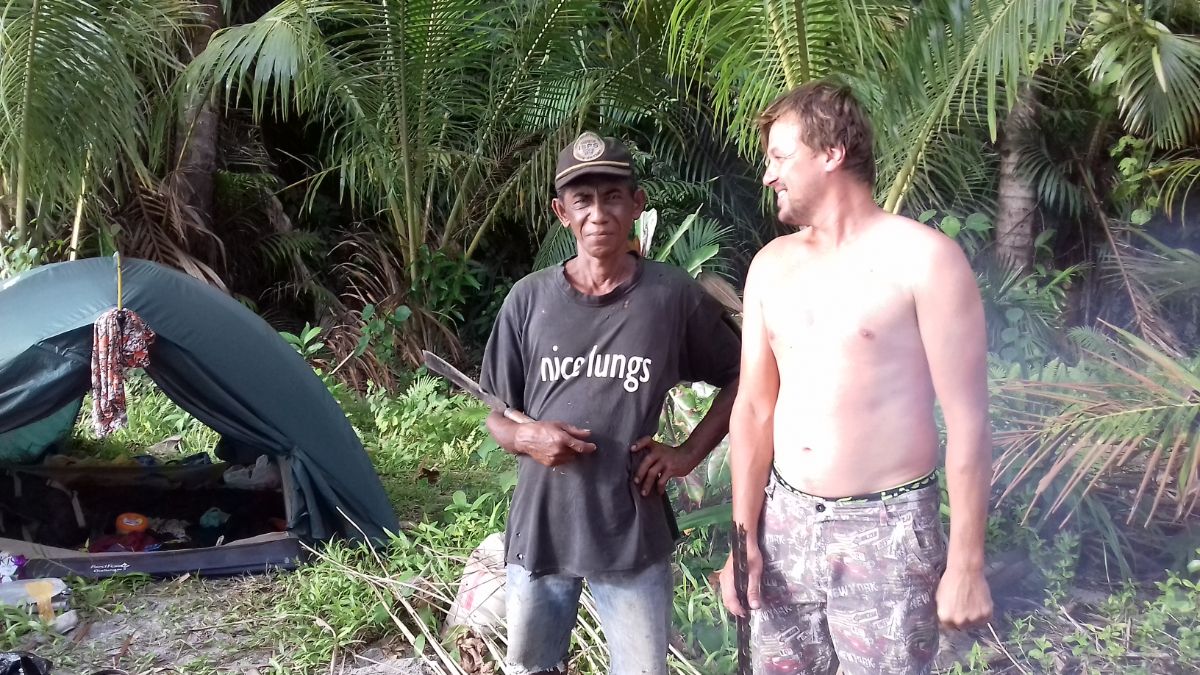 Не можем зажечь костер. Плюс ветер. Паша у одного аборигена стрельнул зажигалку (местные ходят к нам на экскурсию. У них тут реалити-шоу бесплатное "как белые выживают в джунглях"). Но иногда им становится нас жалко и они то с костром помогут, то ветви пальмы для разжига своим мачете порубят