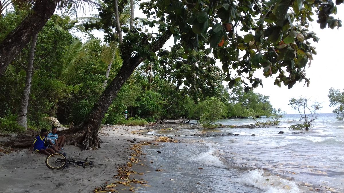 Дальше дорога вдоль берега заканчивается. Есть только тропа вглубь острова к какой-то деревне. Нам туда не нужно. Нам бы как можно дольше пройти ногами вдоль берега, чтоб спустить лодку на воду как можно ближе к северной оконечности острова, чтоб нас не заливало океанскими волнами.