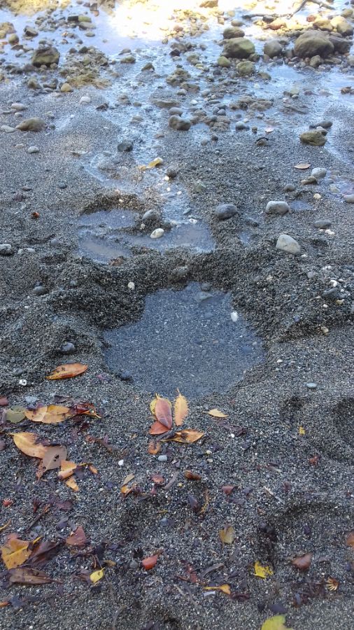 Оказывается, тут есть русло реки, и ручеек бежит под песком и уходит под воду. Как только была выкопана ямка - было реально видно ручей. Что вода течет и уходит в море. А не из моря наоборот.