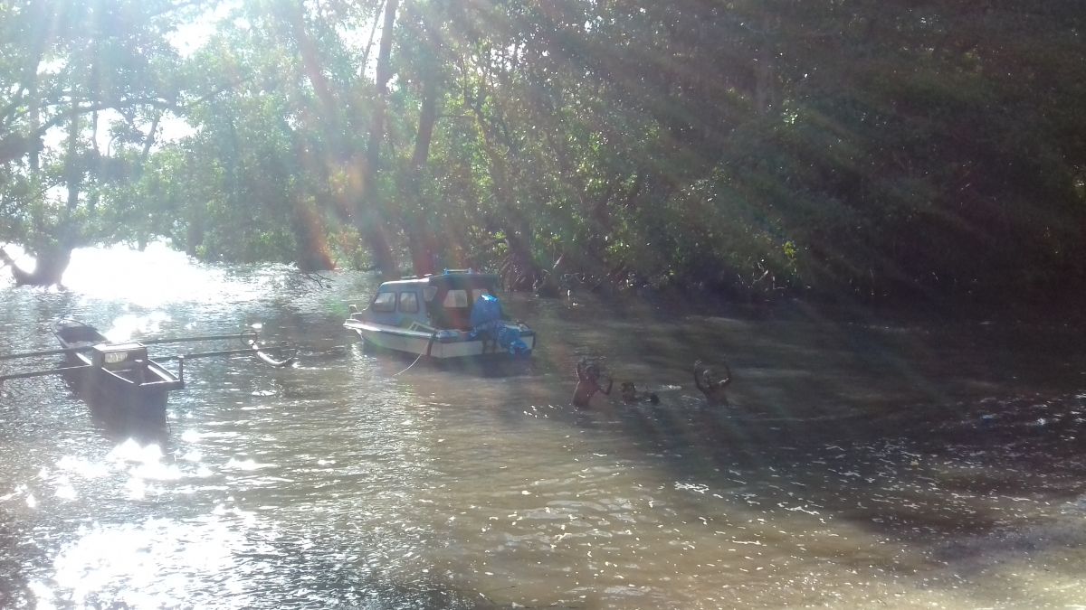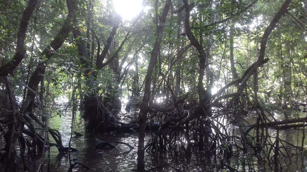 Пробуем идти по берегу. Но тропа постепенно пропадает и мы оказываемся окружены манграми.