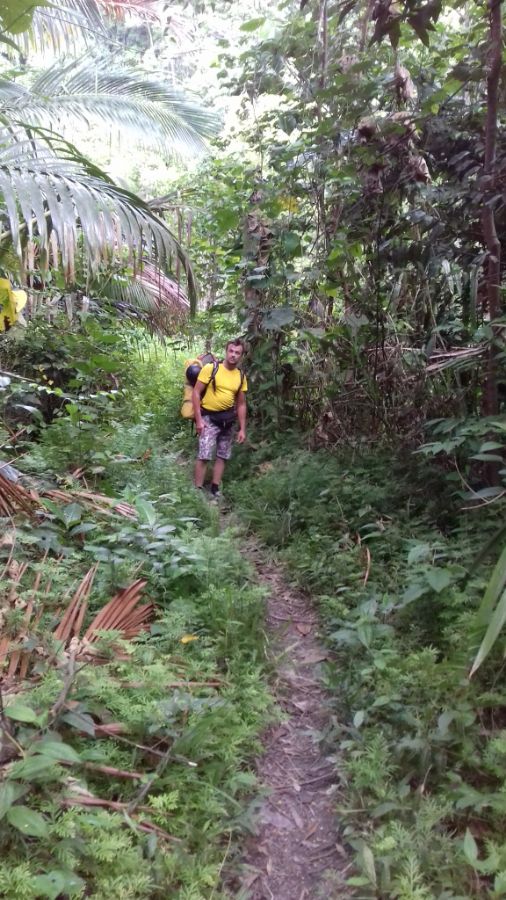 Ну а потом это уже была просто узенькая тропинка в джунглях. Но судя по всему, она была дико популярна. По ней во все стороны совали местные, как правило с дурианами в разнообразных емкостях. Женщины несли тазы с дурианами на голове. Мужчины на палке, на манер коромысла, несли полипропиленовые мешки с дурианами.