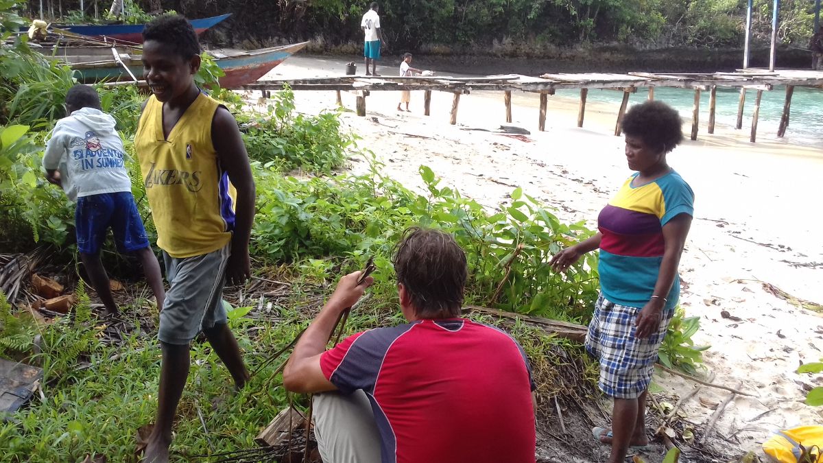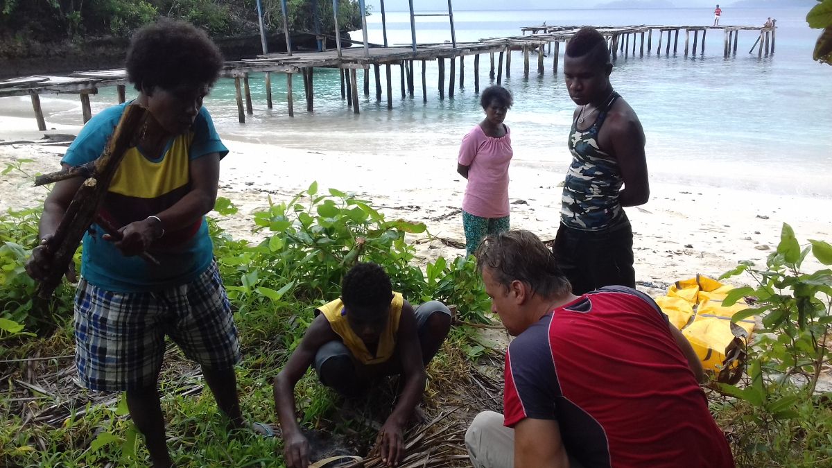 Одновременно с починкой лодки, мы пытались развести огонь, чтоб позавтракать. И как водится - нас спасли папуасы.