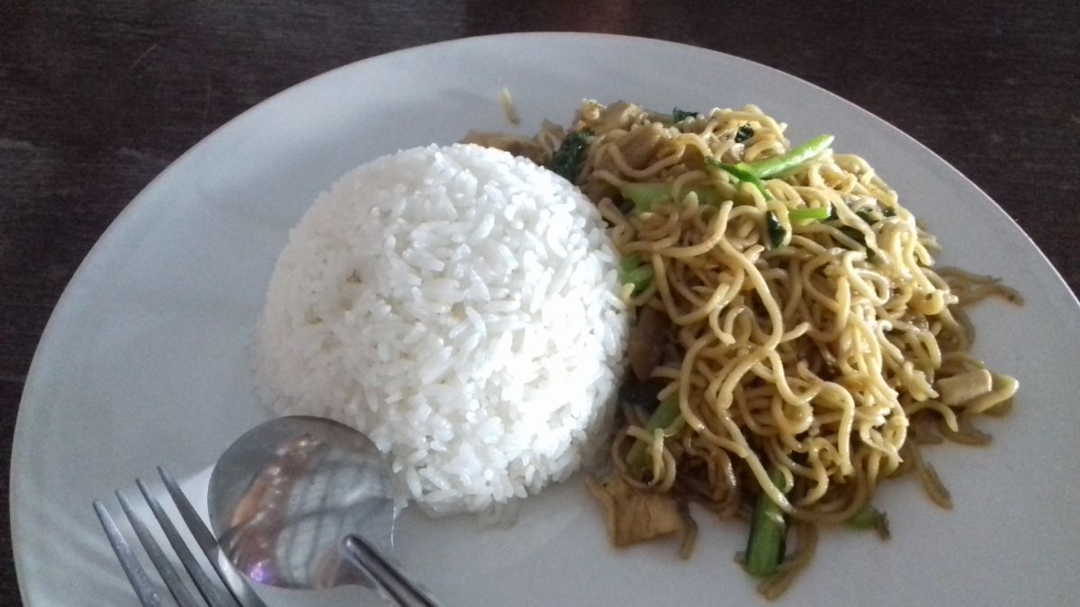 После не совсем удачных попыток найти идеальную столовку (то Паше набор блюд не нравился, то мне), мы нашли столовку, где очень споро накладывали еду, в основном на вынос. Стояла очередь человек в 10. Опять сработала генетическая память. В конце концов и до нас дошла очередь, Паша взял 2 порции Nasi Campur сейчас поесть и 2 на вынос. Порция стоила 10.000.