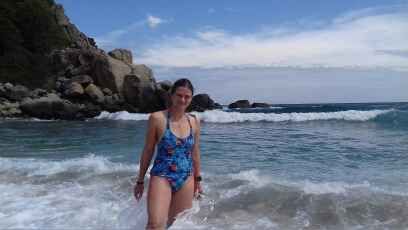 Погода выправлялась. Становилось жарко. Мы спустились уже на побережье. Проезжая вдоль моря, я вдруг захотела искупаться. Прямо в футболке и трусах поплыла. Водичка была прекрасная. Я уже 3.5 месяца не плавала в море, уже отвыкла.