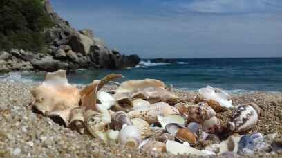 Собираю ракушки на берегу, фотографирую эту кучу на фоне прибоя.